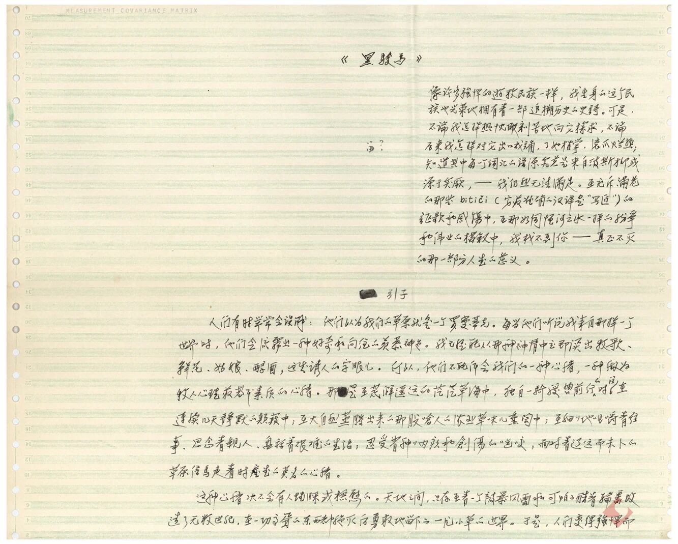 张承志的《黑骏马》手稿安静地躺在无酸盒里。仿佛还能听见蒙古古歌《钢嘎·哈拉》在稿纸边缘游走,像草原上永不落幕的黄昏。张承志写道:“几乎所有年深日久的古歌就都有了一个骏马的名字。”我们今日读它,依然能感受到索米娅的长调、白音宝力格的迟疑,以及一匹黑马踏过冰河的碎响。