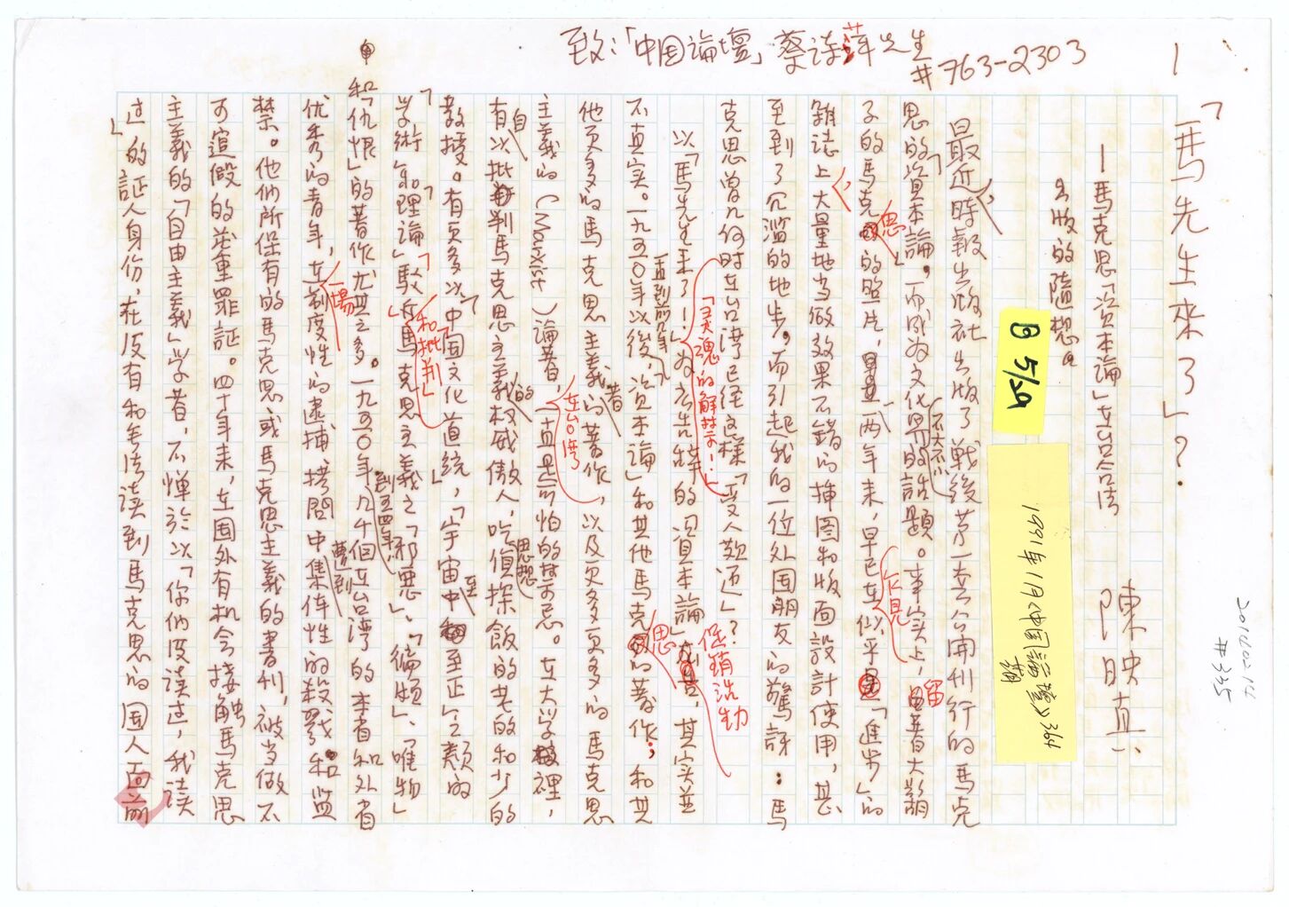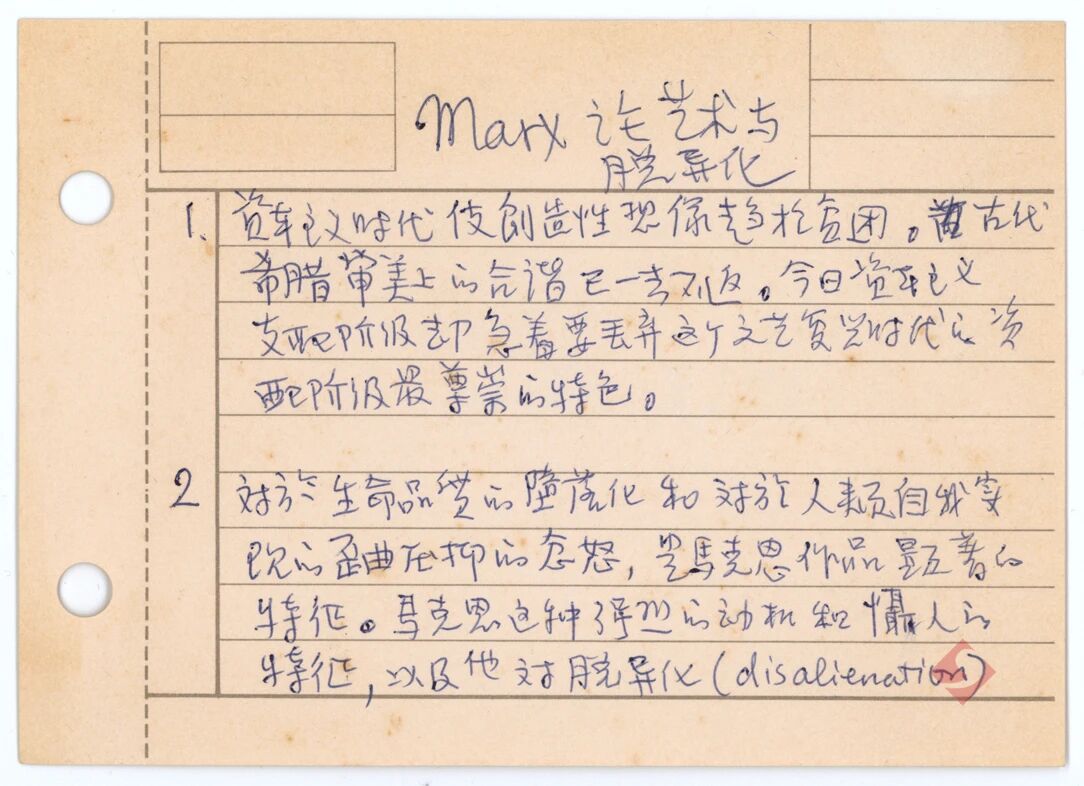 陈映真被誉为“当代台湾最重要的马克思主义倡导者”,在他的笔记卡片上,工整抄录着《Marx论艺术与脱异化》。他在台湾写下《“马先生来了”?——马克思〈资本论〉在台湾出版的随想》,问的是一本书能否跨过海峡,问的也是一个信仰能否重新发芽。马克思主义这匹千里马,在他笔下化为一盏海峡对岸也能望见的灯塔。