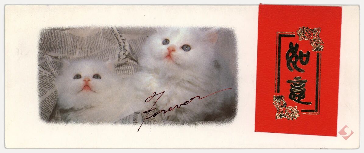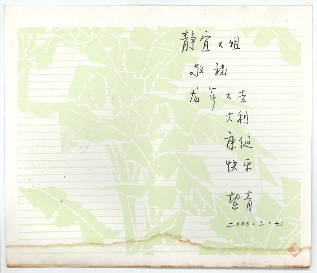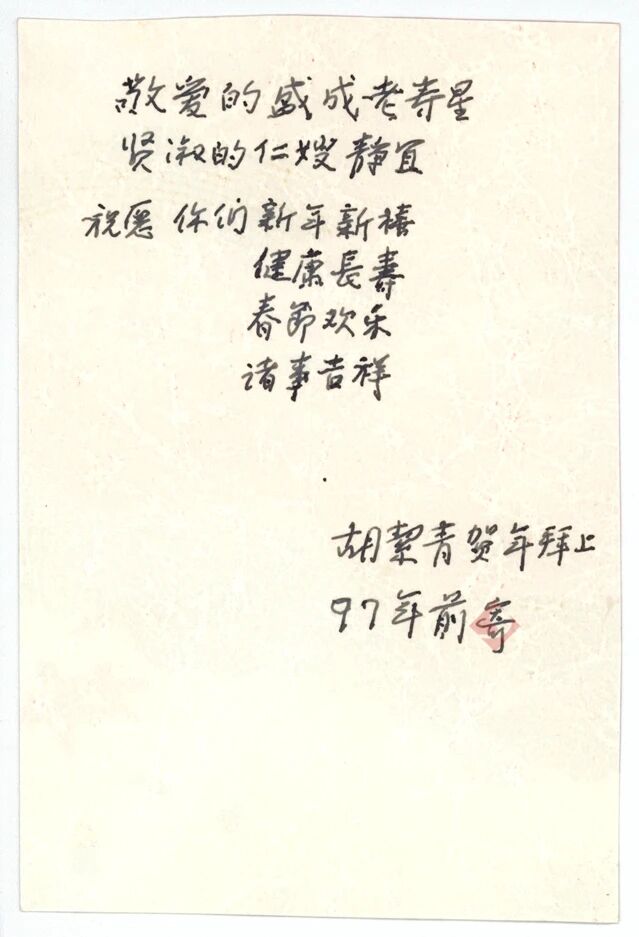 1997年,贺卡上印刻着红色的如意、郑重写下一句“新春新禧 健康长寿”。