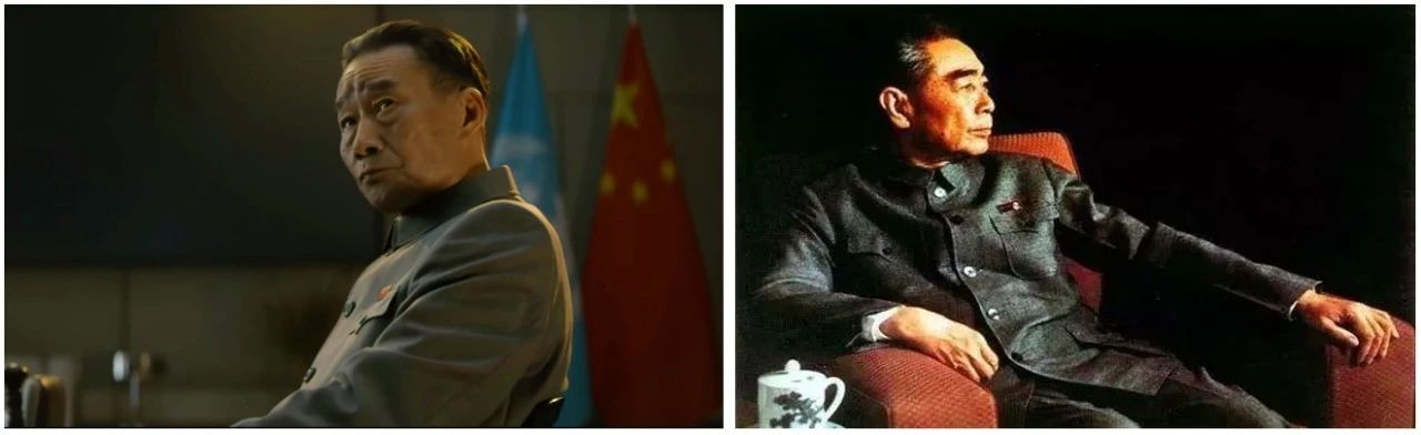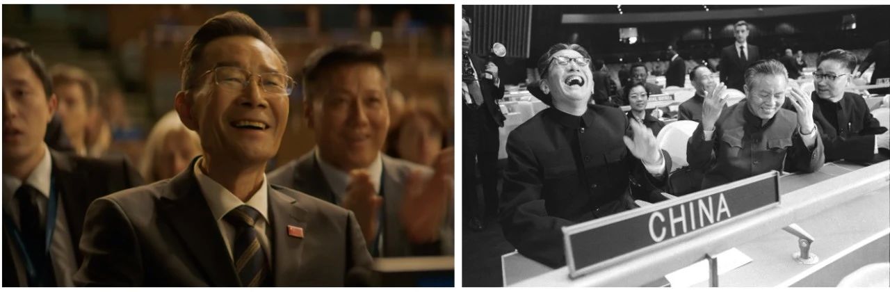 1950—1970年代的形象符码同样体现了这种历史对未来的影响,对此,一个极具象征性的符号是《流浪地球2》中周喆直的形象。电影颇为用心地通过一系列服装、造型的设计将其与周恩来的经典形象相联系(见图3、图4),周喆直在联合国大会上的特写镜头也似乎有意模仿了著名的“乔的笑”(见图5、图6)。有意味的是,周喆直在电影中的身份是中国驻联合国的外交官,而周恩来、乔冠华无疑都是新中国外交史上最著名的人物,将周喆直与这些形象建立关联,似乎有意表明中国外交政治优良传统的一贯延续。毋宁说,周喆直之所以能够成为最高智慧与权威的象征,恰恰是由于1950—1970年代的政治历史为其提供了支撑。更为重要的是,这一时期中国的外交政治不仅关乎一般意义上的国际关系,更标志着社会主义中国在国际秩序中获得了自身的主体地位,因而这其实也是一段民族情感高度膨胀的历史。在这一意义上,周喆直的形象同时成为召唤民族认同的图腾神话,充当着社会主义中国的“意识形态崇高客体”[25]。这一人物在克服危机中起到的关键作用也表明,对未来的想象仍高度依赖于社会主义中国的历史经验,并需要将某种潜在的民族主义认同作为其底层的情感动力。另一个可供参照的细节是,两部电影都有意设置了一组中俄之间的友谊关系——刘培强和马卡洛夫、张鹏和诺夫,从师傅张鹏到徒弟刘培强,似乎也强调了这种友谊的传承延续。中俄友谊实际上内在关联着1950年代以来中苏关系的历史传统,这无疑涉及冷战时期的二元格局,以及社会主义中国在国际世界的阵营归属。第一部中提到加加林时代的太空禁酒令,第二部中刘培强乘坐的俄罗斯首次登月留下的返回舱,似乎也都暗示着冷战时期美苏太空竞赛的历史,以及中国在这一背景之下的特殊位置。类似的细节都说明,1950—1970年代中国的政治历史在很大程度上介入了科幻关于未来世界的想象,且相比于古代中国所提供的文化氛围,社会主义中国在更深层面影响了科幻想象背后的政治框架。