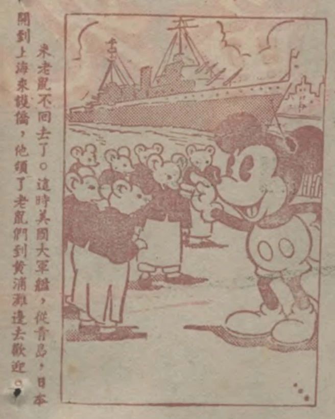 米老鼠乘了美国兵舰到了上海的黄浦滩边,正要登岸,上海的许多老鼠欢迎他。