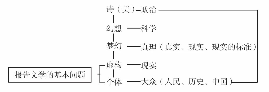 按照新时期的宣传口径,科学即真理,系万众理所皈依的最高真实、现实。而美、梦幻、诗则隶属个体想象、虚构的范畴。至于政治,它“原本是指集体或群体”[36]的。历史也是跟人多(“众”)连在一起的,孤立的个体构不成史。即此而言,诗与政治、梦幻与真理、幻想与科学的问题,可置换或大体等价于报告文学的基本问题:虚构与现实、个体与大众、人民以至中国、历史的关联。上述推导,大致如下图: