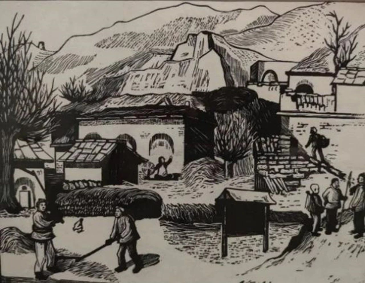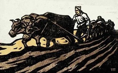 反映陕甘宁边区生活的《牛犋变工队》胡一川版画,1943年