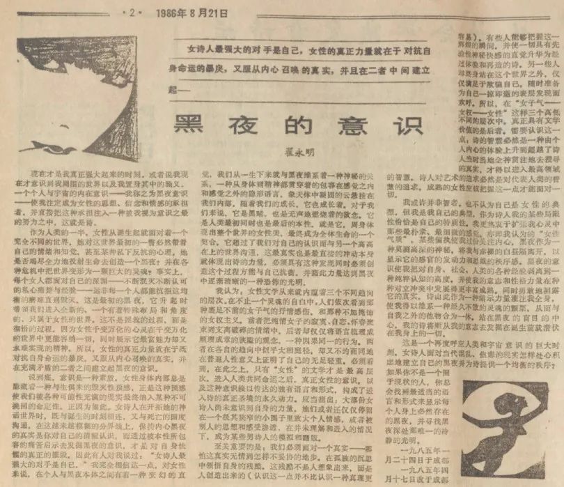 《黑夜的意识》首次公开发表于1986年8月21日总第47期的《诗歌报》上,该期第二版为《创世纪——青年诗人谈诗》专栏,《黑夜的意识》发于该版头条。在文章的开头,翟永明明确给出了“黑夜意识”的定义:“一个个人与宇宙的内在意识——我称之为黑夜意识——使我注定成为女性的思想、信念和情感承担者、并直接把这种承担注入一种被我视为意识之最的努力之中。这就是诗。”[5]破折号连接的三个短语揭橥了翟永明诗歌的三个面向:“内在”“黑夜”“女性”,而这三者凝结而成的是“诗”这一究极概念。翟永明后文的论述亦围绕这三个关键词展开,通过“黑夜的意识”这一概念,探讨了女性内心世界的独特性与复杂性,在她看来,女性从诞生起就面对着与男性完全不同的世界,她们的生命经历和情感体验被深深地打上了性别的烙印。这种“黑夜的意识”使女性成了思想、信念和情感的承担者,并将这种承担转化为诗歌创作的源泉。在翟永明的表述中,女性的力量在于她们能够同时对抗自身命运的暴戾,又服从内心的真实,并在矛盾中建立起自己的意识,这种“黑夜的意识”使女性能够从内心深处感知到生命的真实和美丽。在彼时的翟永明看来,“黑夜意识”不仅是对女性存在状态的描述,也是对女性诗歌创作过程的深刻理解,正是这种意识使女诗人能够在诗歌中展现出与众不同的视角和深度,体现女诗人面对个人与宇宙之间关系时的独特见解。通过诗歌,女性诗人探索自我,挑战传统的性别界限,实现对内在世界的深刻洞察与表达。从上述表述中可以看出,此时翟永明对“诗”的理解尚停留在“关注内心的女性文学”阶段,还未明确触及她后来反思文章中所言的“严肃公正的文本含义上的批评”[6]。唐晓渡写作《女性诗歌:从黑夜到白昼》一文时,或许由于无法完全理解和体会女性的生活经验和情感体验,更无从准确地捕捉女性诗人诗歌写作的内涵与意义,因而他的论述,全然依照翟永明彼时的思路展开。而此后,“女性诗歌”这个概念便以这种简化、固化的方式在诗歌批评场域流行开来。恰如周瓒所言:“不成熟的批评话语往往容易蜕变成衡量写作的标准。简单地讲,事情变成了这样,好像女诗人似乎必须写出像女诗人的诗。”[7]