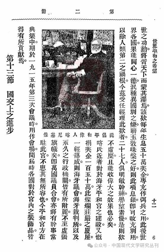 然而,《进步》杂志指向种族竞争、优胜劣汰的进步论调,却在涉及卡内基的《世界平和之希望》一文中转向反面。这篇由颐谷编译的文章强调“平等自由,为人人应享之权利,不能以种族之强弱,境遇之穷通,而分轩轾”[20]。在这样的语境中,《进步》杂志呈现给读者的,是一个与社会达尔文主义的论调几无关系的卡内基形象——文内特意配了一幅卡内基的照片,图注标示“提倡平和伟人喀尼基像”[21]。这样,《进步》杂志的进步论调便呈现出与梁启超所论截然相反的两副面孔。梁启超在引介卡内基时虽然对内主张种族竞争、优胜劣汰,对外反对种族竞争、警惕帝国主义的殖民扩张,但其笔下无论是以进取为慈善导向,还是作为托拉斯大王的卡内基,基本都是一个代表着美国优胜劣汰、不断进取的社会达尔文主义思想的进步论者形象。然而在《进步》杂志这里,卡内基的形象已与进步论者完全相反,且与杂志本身的宗旨南辕北辙。这既揭示出清末民初译介的卡内基形象的复杂性,也进一步反映了带有社会达尔文主义的进步观念的困境,牵涉出一条清末以来全球思想脉动中的进步论线索。当梁启超们想要把美国种族竞争、优胜劣汰的进步观念引入国内时,却不得不考虑这种社会达尔文主义存在反噬自身的危险。在这样的进步论张力中,清末民初的卡内基既是指向优胜劣汰的进步论者,也是倡导和平、反对种族竞争的伟人。因此,到底该如何向国内读者引介卡内基,“进步”观念如何在中国落地、如何改造,便成为摆在民初仁人志士前的伦理难题。