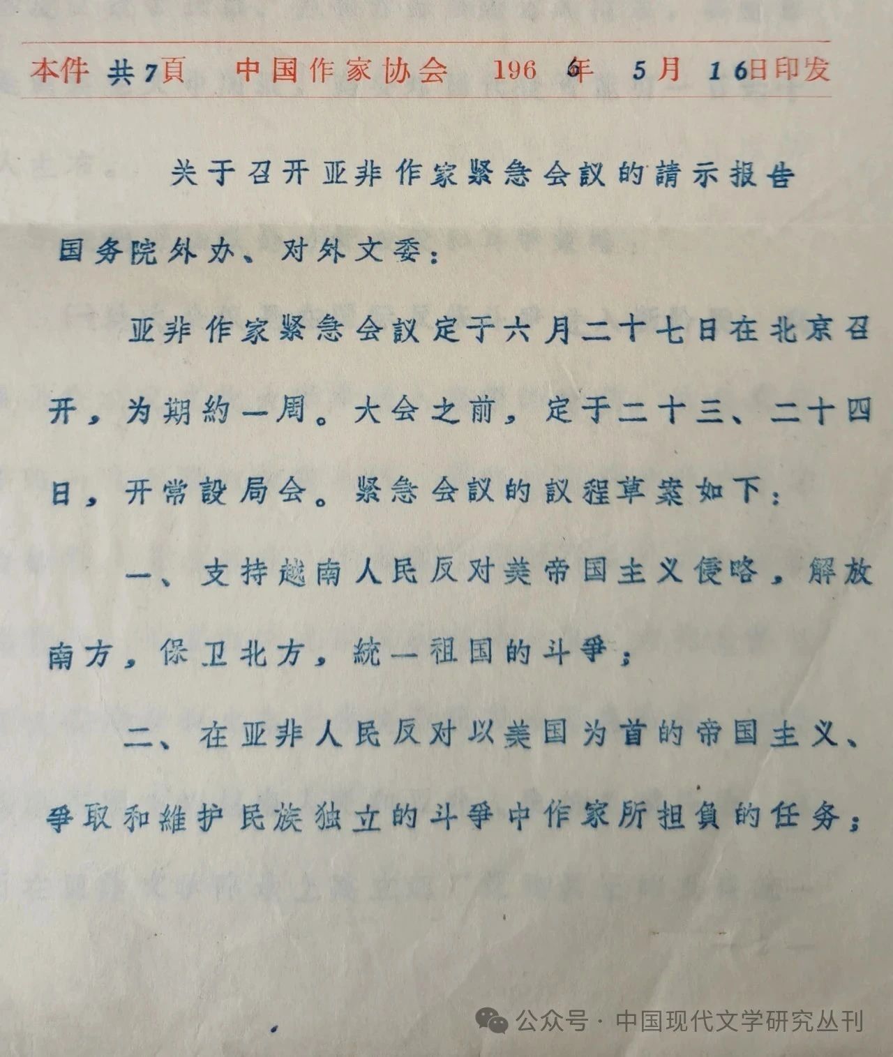 1966年为什么会在北京召开一场亚非作家紧急会议?紧急会议,急在何处?目前的一致看法是为了应对苏联对亚非作家会议活动的分裂。这种看法因有亲历者的证词而显得可信。参与紧急会议组织工作的中国作协干部林绍纲就回忆称“在中苏关系恶化的背景下,一批亲苏的作家,于1966年6月19日至20日,在开罗召开了一次所谓的‘亚非作家会议’”,会议通过的决议“被中国和一些与中国友好国家的作家认为是‘分裂的决议’。为此,亚非作家紧急会议于1966年6月28日在北京开幕”。[4]作为中国作家代表参加紧急会议的徐怀中也称苏联“纠集一些国家,企图另起炉灶”[5]是会议紧急召开之原因。陈丹晨在《巴金全传》中也持同样观点。[6]这几种说法所表达的基本内容是一致的,即因为苏联作家在开罗组织了一次“分裂”的会议,中国作家便紧急行动起来,在北京召开亚非作家紧急会议,以应对其分裂行为。然而《报告》提到,“亚非作家紧急会议定于六月二十七日在北京召开”,亚非作家常设局已向包括苏联在内的“亚非五十五国发出邀请”。报告还提及“苏修正伙同印度、阿联等破坏紧急会议”,并且“将来还要在会内会外继续破坏,我须充分警惕。估计苏修是会来参加会的,我们要点苏修的名”。可见,1966年5月16日《报告》递送时,亚非作家紧急会议的名称、议程及日期等均已基本确定,并已向广大亚非作家发出邀请。而此时,苏联作家尚未公然分裂,中国作协也认为他们会来参会,并且计划当其来参会时对其进行斗争,而未料到其会另起炉灶。那么,发生在后的1966年6月19日苏联主持召开的开罗会议,显然无法成为一个多月前就已经确定了会议名称及议程的亚非作家紧急会议召开的动因。事实上,这次紧急会议召开之最初原因,并非回应苏联作家的分裂行为,而是为了声援越南抗击美国侵略。