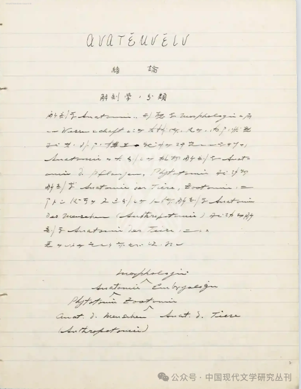 一是由于体量小,无法单独列编,如收据、题赠、账目等。不过,“杂编”中的“课堂笔记”数量相当可观,足以独立成编。鲁迅的“课堂笔记”现存14部,共计2598页,其中,鲁迅在江南水师学堂的课堂笔记有1种,《水学入门》手稿54页。在江南陆师学堂附设矿务铁路学堂的课堂笔记有5种,其中《开方》手稿8页、《开方提要》手稿121页、《几何学》手稿124页、《八线》手稿9页、《金石识别》批校本394页。在日本仙台医学专门学校的医学笔记6册,鲁迅在包封上题为“仙台医专讲义录”,有《组织学》手稿349页、《解剖学》手稿306页、《有机化学》手稿296页、《五官学》手稿325页、《血管学》手稿334页、《病理学》手稿193页。1908年夏在日本东京听章太炎讲文字学课的笔记两种,《说文解字札记》手稿33页、《说文解字》手稿52页。“课堂笔记”在《新编鲁迅手稿全集》中列为第64—70册,共7册。相较而言,鲁迅的文稿编有5册,译稿编有4册,日记编有5册,课堂笔记编体量更为庞大,却没有列入“正编”,获得独编的地位,究其根因,恐怕还是根深蒂固的狭义手稿学的执念。