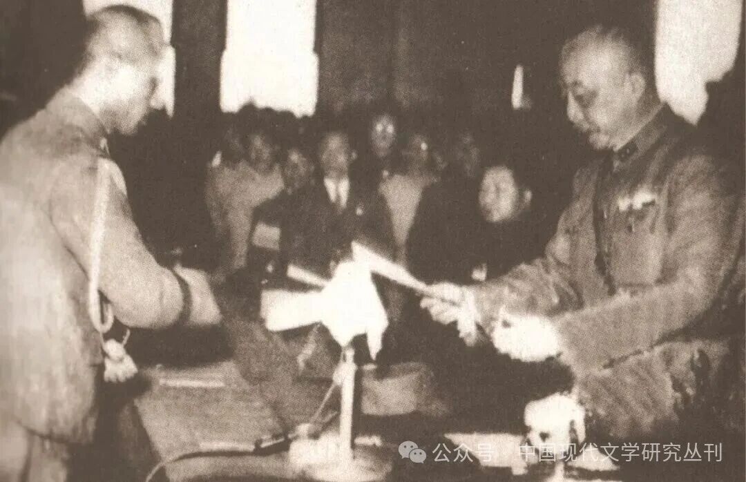 1945年10月25日,中国战区台湾省受降主官陈仪(右一)接受日本投降代表的投降书
