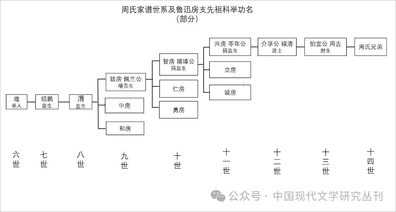实际上,“父亲的病”只是“家道中落”的次要一环,鲁迅祖父周福清陷入“贿考案”才是家族溃决之始,也是致命一击。在传统中国,大家族繁衍发展的关键不在于财富积累,而有赖历代子弟科考入仕,是谓“士绅继替常轨”[16]。鲁迅家族有悠久仕宦历史,祖上明代正德年间定居绍兴,自第一世祖以来共计出过一个进士、三个举人和数个秀才。六世祖周煌(韫山公)中举,令家族社会地位有了明显提高:“至乾隆年,分老七房、小七房。韫山公生七子。合有田万余亩,当铺十余所,称大大族焉。”[17]