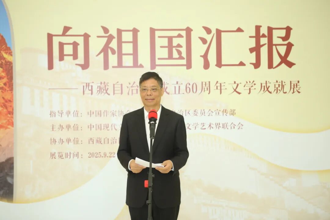 9月22日,由中国作协、西藏自治区党委宣传部指导,中国现代文学馆、西藏自治区文联主办,西藏自治区作协协办的“向祖国汇报——西藏自治区成立60周年文学成就展”开幕式在中国现代文学馆举行。中国作协主席、党组书记张宏森,西藏自治区党委常委、宣传部部长汪海洲出席开幕式并致辞。西藏自治区政协副主席、自治区文联主席扎西达娃,中国作协党组成员、书记处书记何向阳,西藏文联副主席、西藏作协主席次仁罗布,国家民族事务委员会文化宣传司副司长左尚武出席开幕式。中国作协党组成员、书记处书记李一鸣主持开幕式。