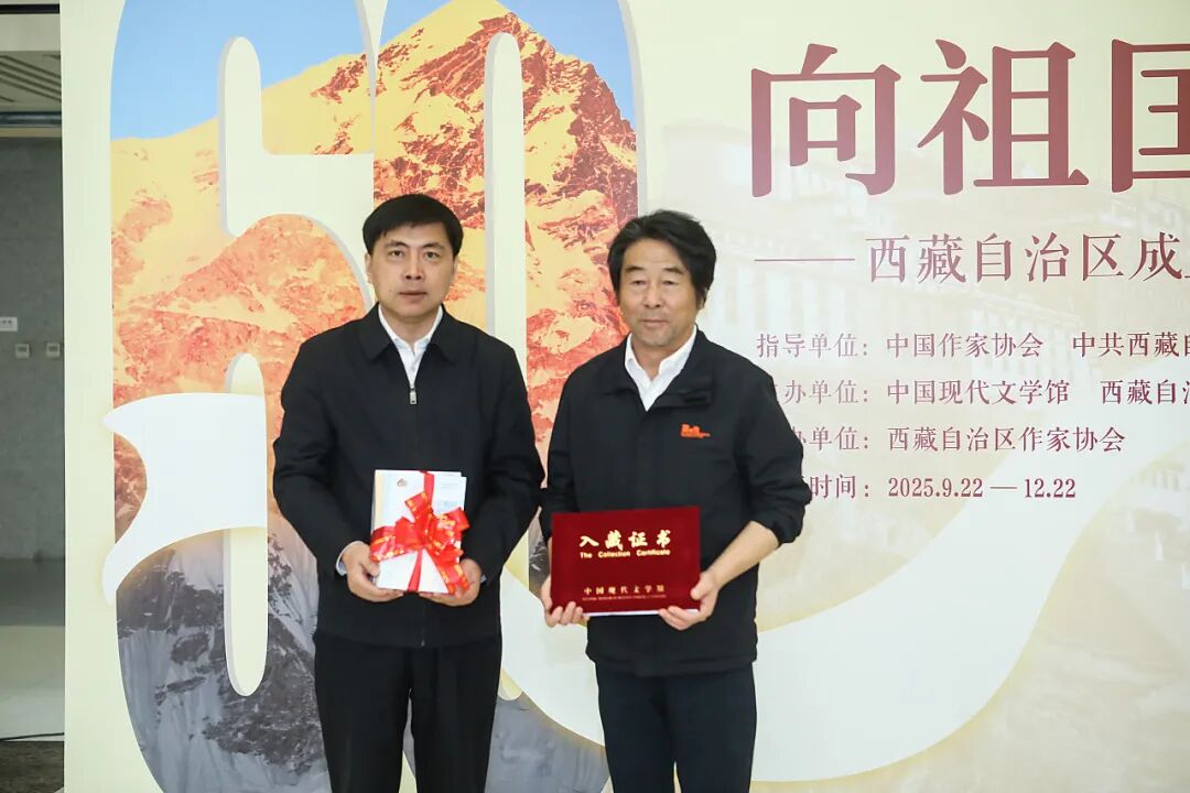 为全景展现西藏60年文学事业发展的蓬勃成果,进一步铸牢中华民族共同体意识、推进中华民族共同体建设,中国现代文学馆和西藏文联共同主办“向祖国汇报一一西藏自治区成立60周年文学成就展”。展览以铸牢中华民族共同体意识为主线,包括“时代烙印与民族风情交织的西藏文学”“多元共生与风格交融的西藏文学”“时代脉动与心灵共振的西藏文学”“铸牢中华民族共同体意识的文学实践”四个部分,以近300件手稿、书籍、期刊、证书、奖杯等实物,系统梳理从西藏自治区成立至今西藏文学的壮阔历程。