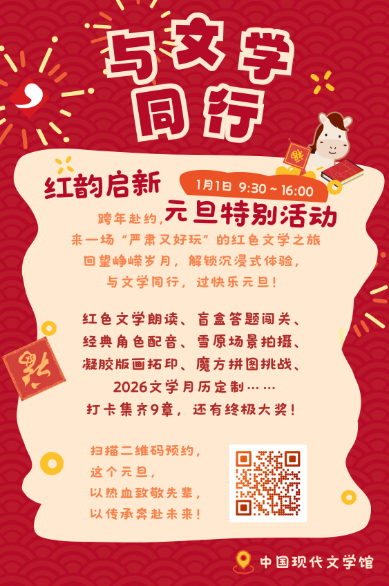 新的一年,从“文学”开始!中国现代文学馆“与文学同行·红韵启新元旦特别活动”,将以丰富的沉浸互动活动,与广大市民一起重温红色记忆、感悟精神力量,在文学的氛围里迎接2026!