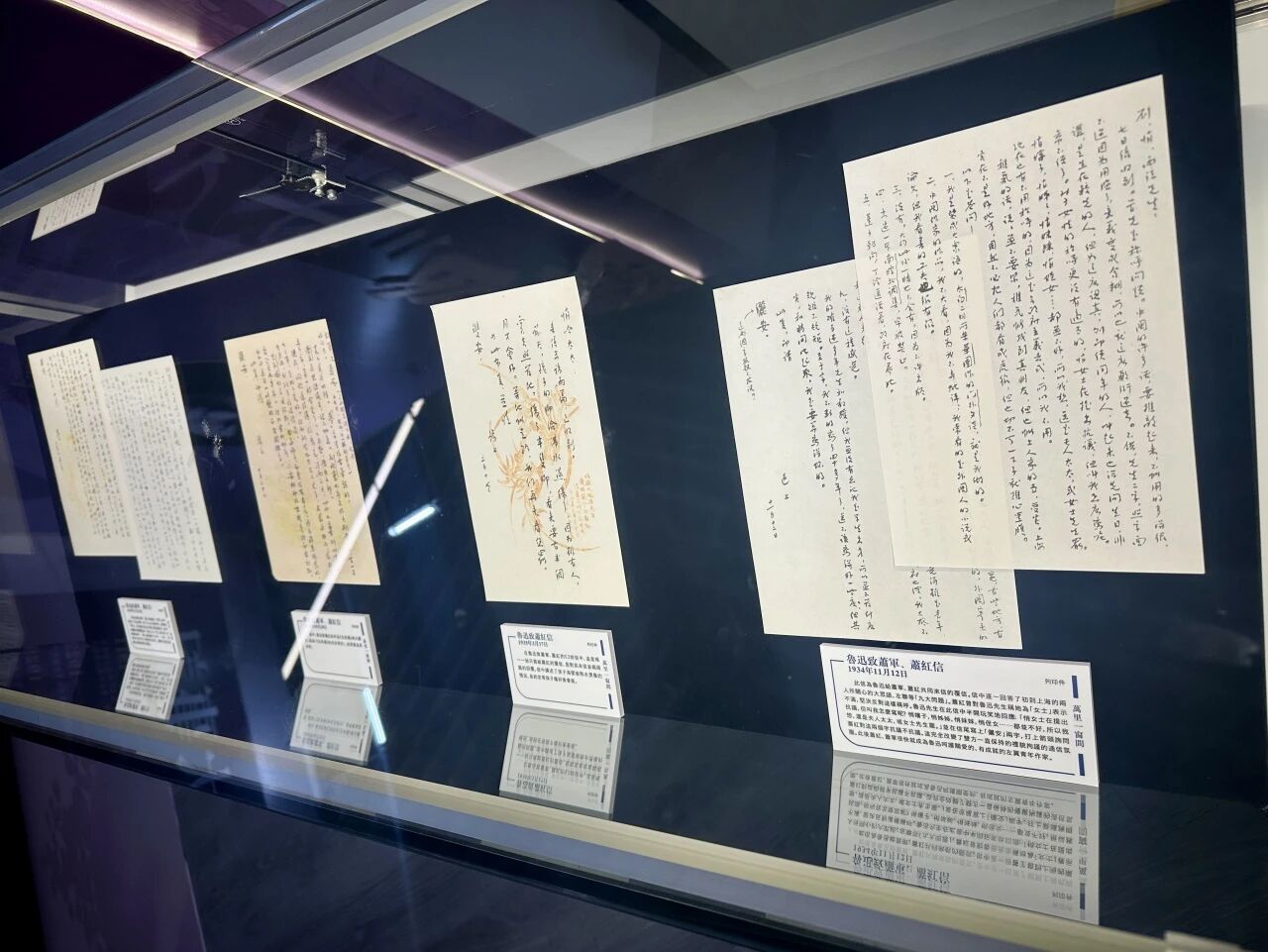 ▲ 鲁迅与萧红、萧军的信件展柜,纸短情长之间,两代作家的精神传承悄然流淌。