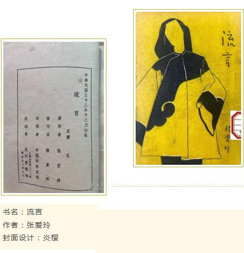 该封面由张爱玲亲自参与出版设计,炎樱绘制了封面,张爱玲绘制文中的插图。封面只用黄黑二色,黄色轻快明亮、黑色沉重严肃,二者搭配既醒目又使色彩得到恰当的调和。中间偏左位置以黑色线条勾勒出身穿古装、散披头发、脸上没有五官的女子,她上半身穿着清装,下半身依稀可见是黑色的旗袍,上半身衣服领口和袖口有黑色滚边,在右斜腰部是向外凸起的云头图案。女子身体处于封面的黄金分割线位置,因头往左偏而不至于呆板具有微微倾斜的美感,这形象俨然是炎樱为张爱玲画的个人肖像。