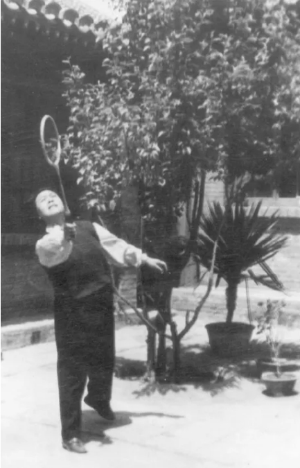 1955年,丁玲在北京多福巷16号寓所院内打羽毛球