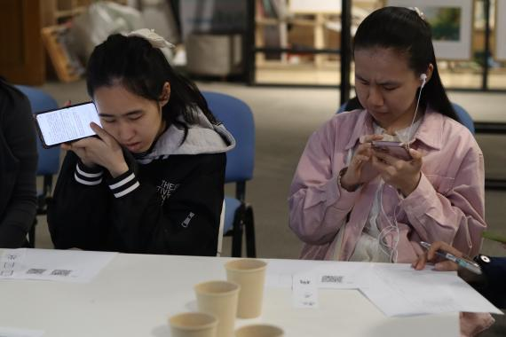 在展厅导赏环节,视障同学们凭借展厅平面摸读图和盲文导览册,在志愿者的帮助下探索各单元展区。由志愿者讲解展厅各单元主题,同学们按照标识寻找藏于手稿展柜处的口述影像二维码及线索。参观中,同学们可以结合摸读图探索展区,通过扫描展厅内布置的口述影像二维码,了解展厅内容,感受展厅的展陈设计。