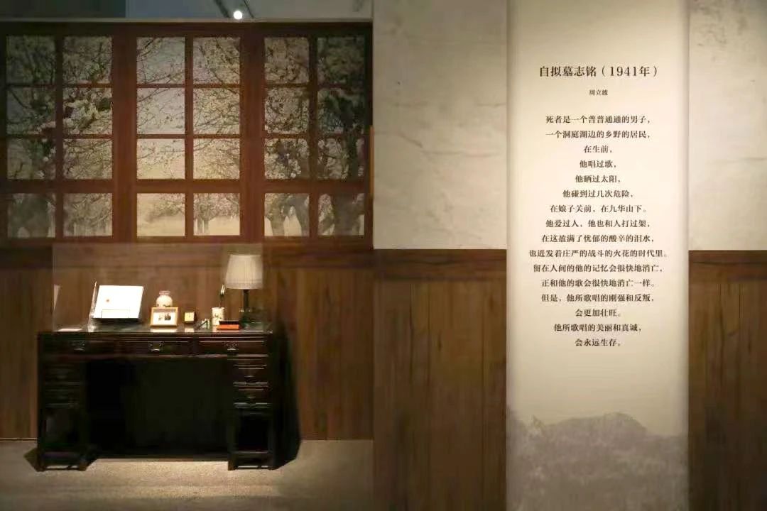《山乡巨变》是周立波的代表作,讲述了清溪乡建立和发展农业合作社的故事。此部分选取“作者”这一叙事视角,选取“变革”这一叙事主题。周立波和柳青一样,也是深入农村写作的典范。从他的任命书开始,到他在田地里劳动的照片和视频,都展现出“立波胡子”的风采。此外,策展人员从清溪村的展览中借鉴经验,把周立波和农民相处的趣事用漫画形式呈现出来,展现作家性格中幽默的一面。这部分最后,回归到作家本身,我们看到33岁的周立波写下的墓志铭:“他唱过歌,他晒过太阳,他碰到过几次危险,在娘子关前,在九华山下。他爱国人,他也和人打过架……”我们也看到他的书房复原样貌,那里有他曾使用的台灯、花瓶、毛笔……