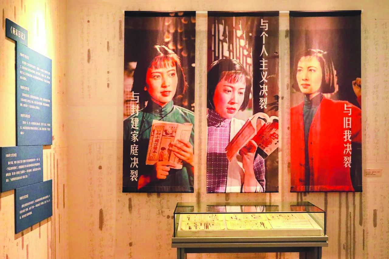《青春之歌》是杨沫的代表作,展现了林道静在党的领导下从一个小知识分子成长为革命者的经历。此部分选取了“作品”这一叙事视角,选取了“求索”这一叙事主题。小说改编成电影《青春之歌》后影响极大,于是策展人员想到利用影视剧中的人物形象展现知识分子的心灵变迁。展厅中可以看到穿着学生装眼神单纯、与封建家庭决裂的林道静,穿着旗袍低头读书、与个人主义决裂的林道静,穿着红毛衣眼神坚定、与旧我决裂的林道静。这三个形象被做成大幅的纱幔,纱幔下则是与每一次抉择相对应的手稿,形象与手稿之间形成呼应。策展人员还邀请获得“《青春之歌》奖学金”的大学生重读此书并撰写感受,不同年代的读者对林道静有不同的体会,这进一步丰富了观展体验。